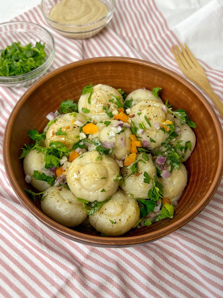 Serve the gnocchi with a sauce of your choice. I served it with homemade tahini sauce.